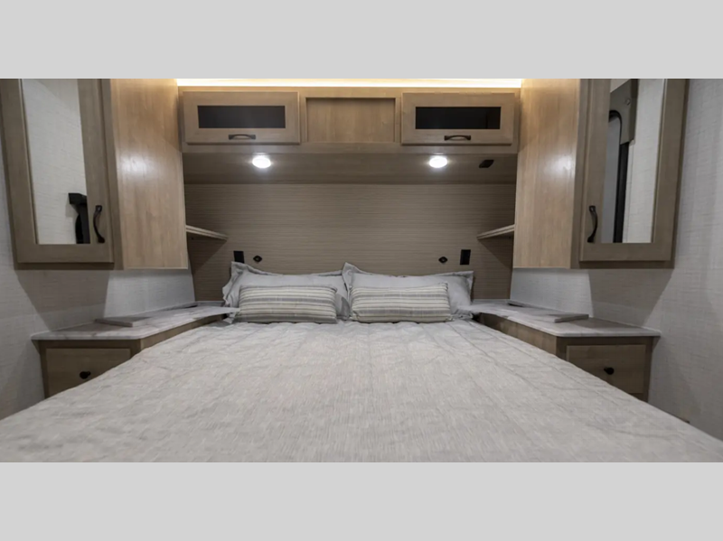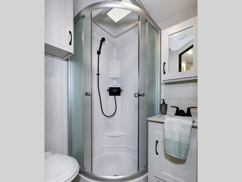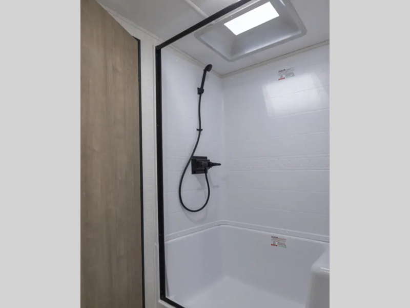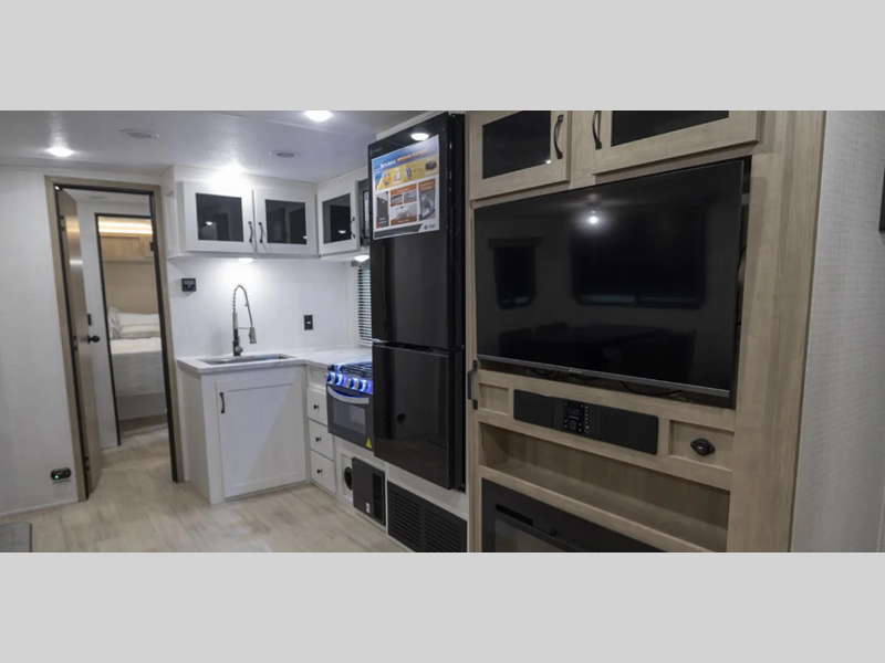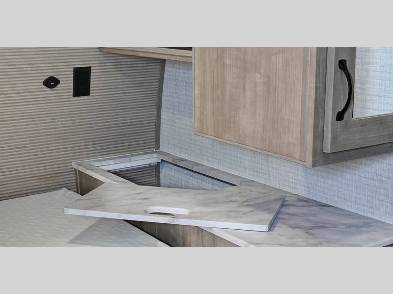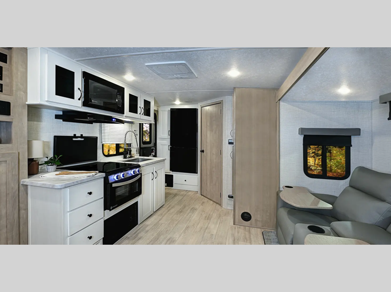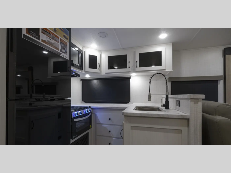 Each model is constructed with a gel coated 3/4 fiberglass cap with diamond plate stone guard, a fully enclosed and heated underbelly, and a fully laminated roof to provide a crowned ceiling. There are smoked glass kitchen cabinet doors inside, along with roller shades, kitchen backsplash, and many more comforts. You'll appreciate the power tongue jack outside to easily hitch up and go, and the 200-watt solar panel will provide some off-grid capabilities!