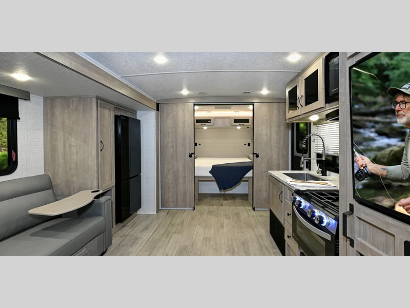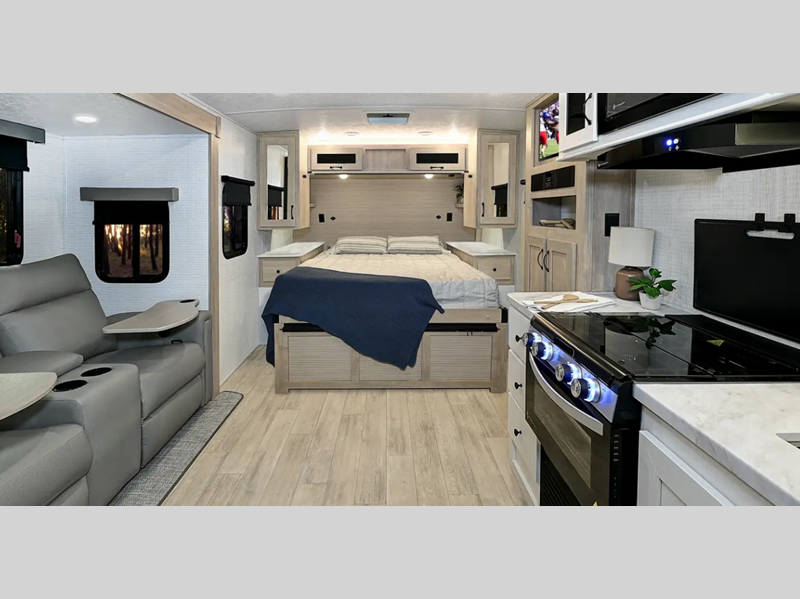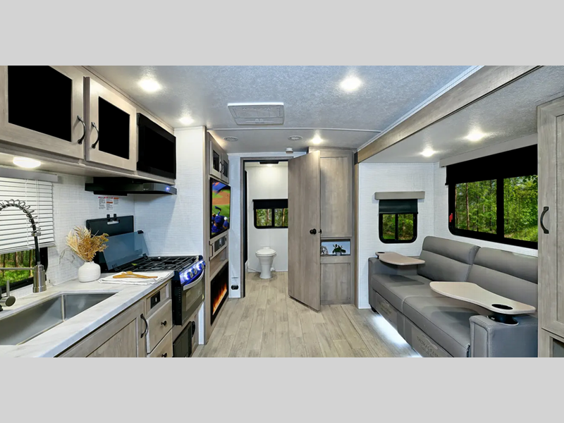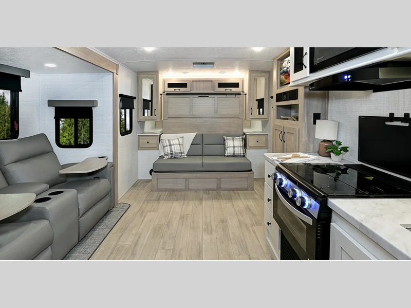 Sleeps 4 Slides 1 Length 24 ft Ext Width 8 ft Ext Height 10 ft 7 in Hitch Weight 660 lbs Dry Weight 4848 lbs Cargo Capacity 1502 lbs Fresh Water Capacity 42 gals Grey Water Capacity 38 gals Black Water Capacity 30 gals Available Beds Queen Murphy Refrigerator Type Electric Refrigerator Size 11 cu ft Cooktop Burners 3 Shower Size 32" x 32" Number of Awnings 1 AC BTU 15000 btu Awning Info 16' Power with LED Lights Axle Count 2 Shower Type Radius Electrical Service 50 amp Similar Floorplans