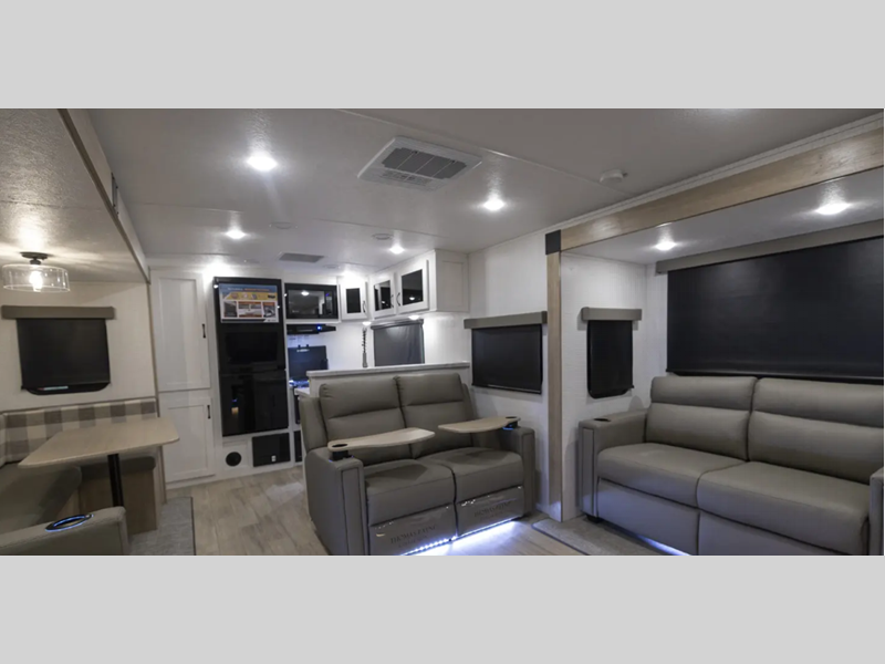 Sleeps 4 Slides 3 Length 37 ft Ext Width 8 ft Ext Height 11 ft 1 in Hitch Weight 1080 lbs Dry Weight 7918 lbs Cargo Capacity 1976 lbs Fresh Water Capacity 42 gals Grey Water Capacity 106 gals Black Water Capacity 38 gals Available Beds King Refrigerator Type Electric Refrigerator Size 11 cu ft Cooktop Burners 3 Shower Size 30" x 48" Number of Awnings 2 AC BTU 15000 btu Awning Info 11' Power with LED Lights Axle Count 2 Washer/Dryer Available Yes Shower Type Shower w/Seat Electrical Service 50 amp Similar Floorplans